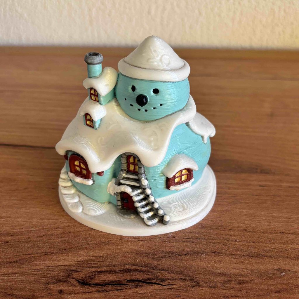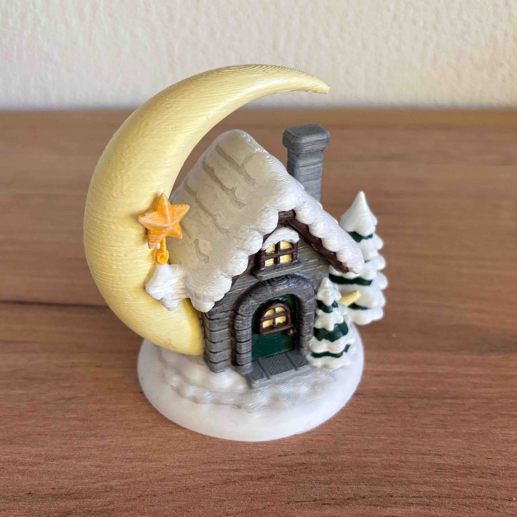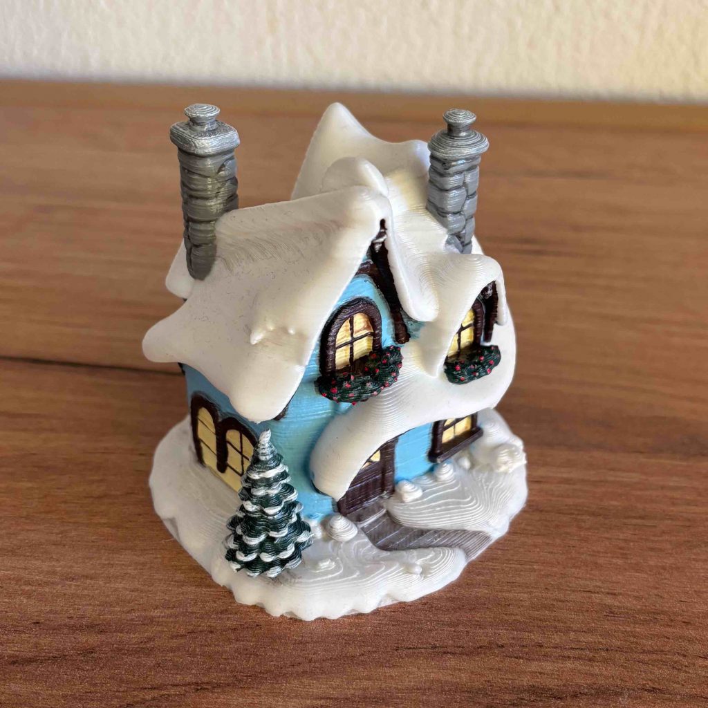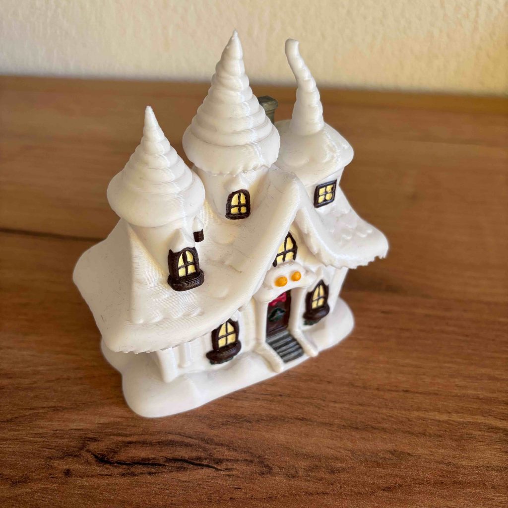 Das abgebildete Weihnachts-Dorf wurde mit weißem Filament gedruckt, und liebevoll von Hand bemalt. Die Bäume sind sogenannte Endlose. Man kann den farbigen Teil durch den weißen Teil durchschieben von oben nach unten und von unten nach oben. Unendlich.