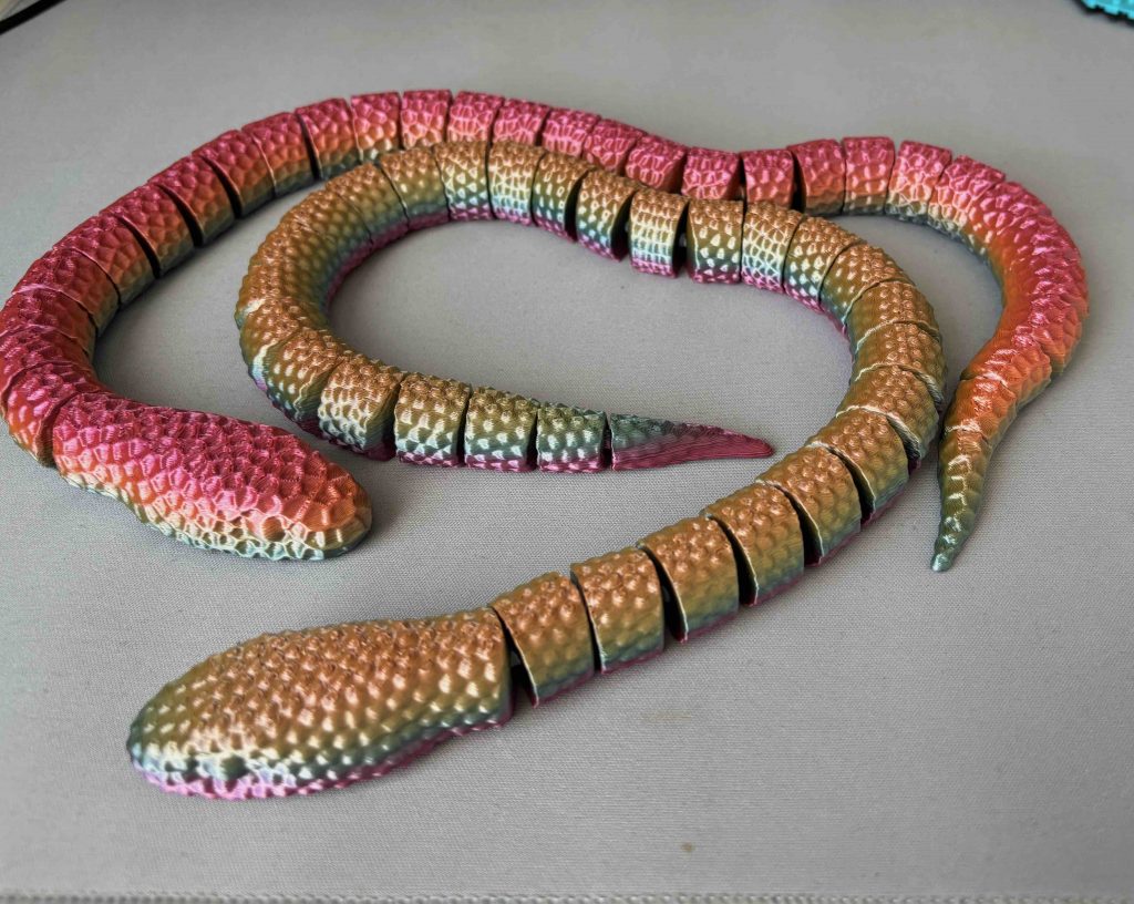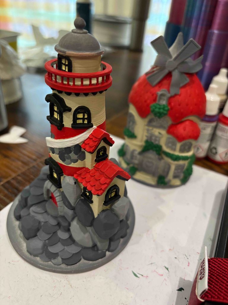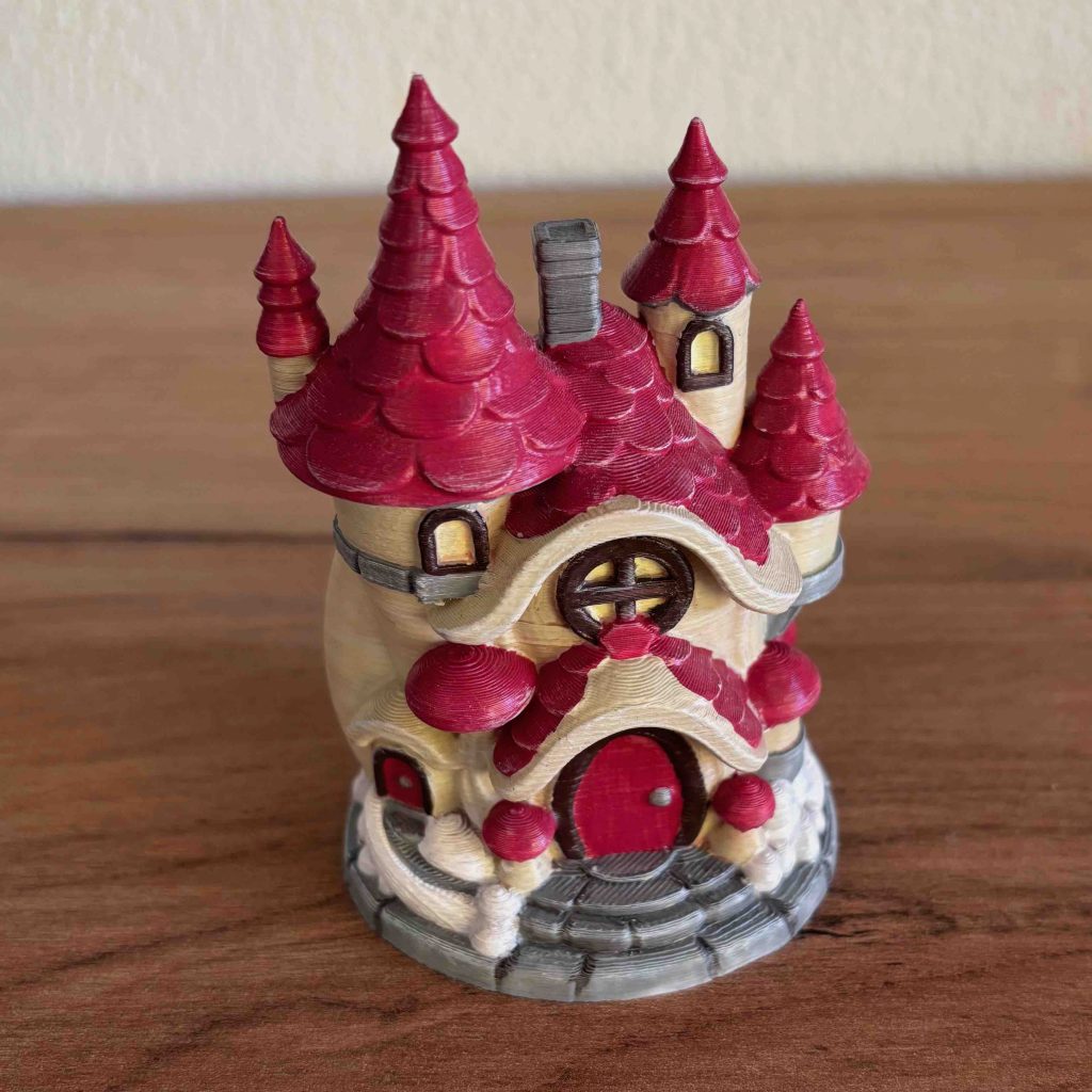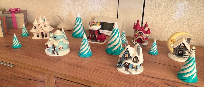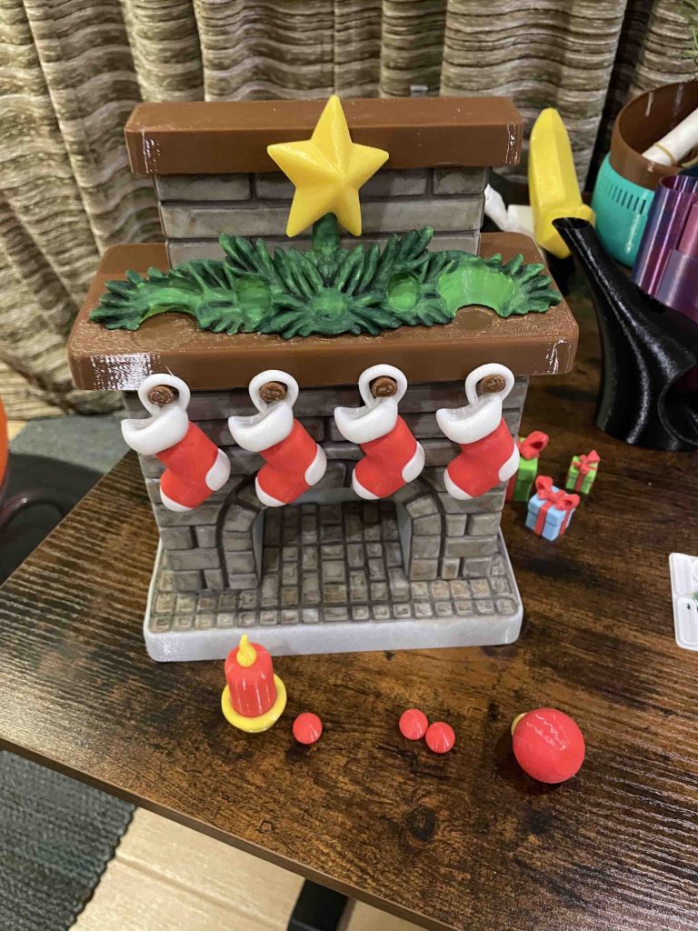 Das abgebildete Weihnachts-Dorf wurde mit weißem Filament gedruckt, und liebevoll von Hand bemalt. Die Bäume sind sogenannte Endlose. Man kann den farbigen Teil durch den weißen Teil durchschieben von oben nach unten und von unten nach oben. Unendlich.